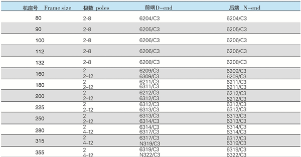 電機通常安裝如下表中所列的單列深溝球軸承。